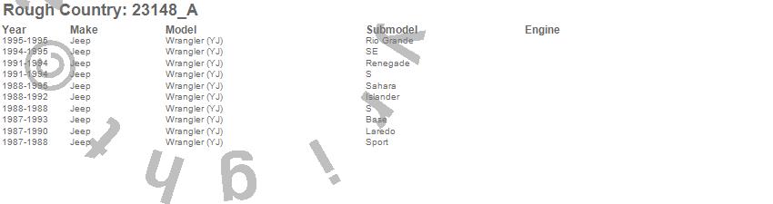 Below is an abbreviated list of applications for the N3 Shocks.Wrangler (YJ), Jeep, 1995, 1994, 1993, 1992, 1991, 1990, 1989, 1988, 1987