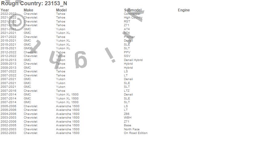 Below is an abbreviated list of applications for the N3 Shocks.Avalanche 1500, Tahoe, Yukon, Yukon XL, Yukon XL 1500, Chevrolet, GMC, 2022, 2021, 2020, 2019, 2018, 2017, 2016, 2015, 2014, 2013, 2012, 2011, 2010