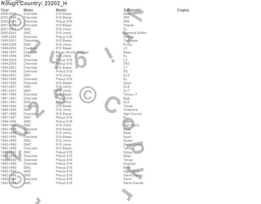 Below is an abbreviated list of applications for the N3 Shocks.Blazer (South America), S10 Blazer, S10 Pickup, S15 Jimmy, S15 Pickup, Chevrolet, GMC, 2005, 2004, 2003, 2002, 2001, 2000, 1999, 1998, 1997, 1996, 1995, 1994, 1993