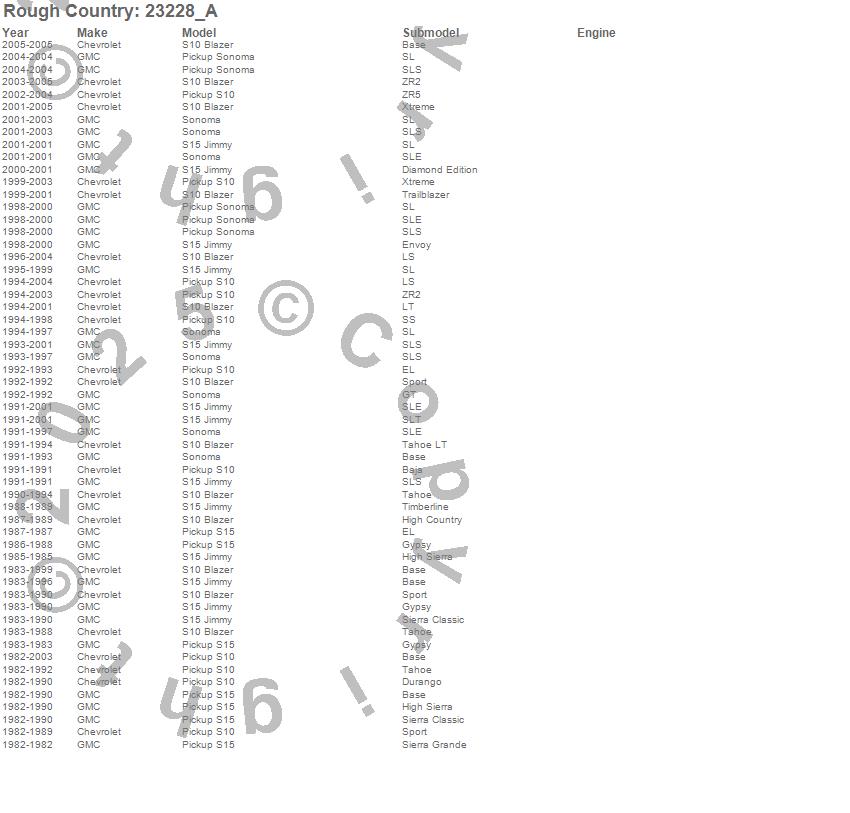 Brand: Rough CountryPart Number: 23228_AShock Absorber Type: Rear - 2-4.5 in. - 35 mm. Piston - 54 mm. Shock Body - 36 Kilonewton Tensile Strength - Extended Length 26.02 in. - Collapsed Length 15.55 in.UPC: 843030181604