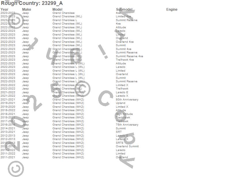 Below is an abbreviated list of applications for the N3 Shocks.Grand Cherokee, Grand Cherokee (WK2), Grand Cherokee (WL), Grand Cherokee L, Grand Cherokee L (WL), Jeep, 2023, 2022, 2021, 2020, 2019, 2018, 2017, 2016, 2015, 2014, 2013, 2012, 2011