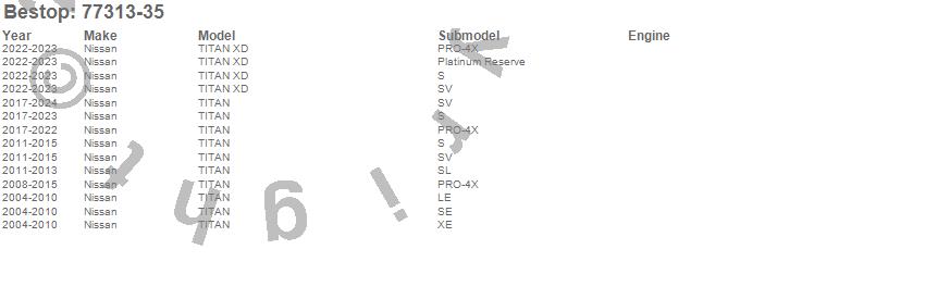 Below is an abbreviated list of applications for the Supertop For Truck.TITAN, TITAN XD, Nissan, 2024, 2023, 2022, 2021, 2020, 2019, 2018, 2017, 2015, 2014, 2013, 2012, 2011, 2010, 2009, 2008, 2007