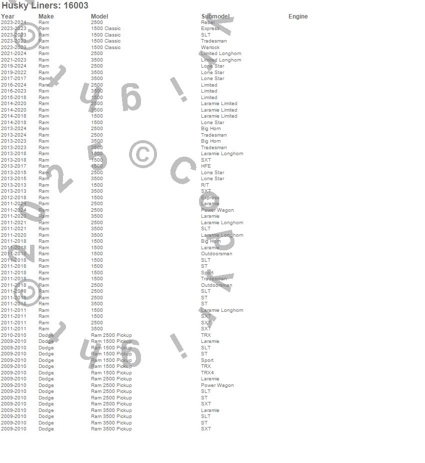 Below is an abbreviated list of applications for the Heavy Duty Bed Mat.1500, 1500 Classic, 2500, 3500, Ram 1500, Ram 2500, Ram 3500, Dodge, Ram, 2024, 2023, 2022, 2021, 2020, 2019, 2018, 2017, 2016, 2015, 2014