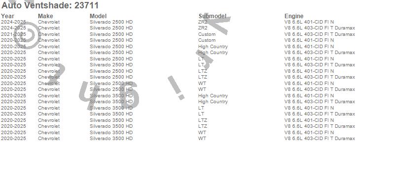 Below is an abbreviated list of applications for the Bugflector Stone/Bug Deflector.Silverado 2500 HD, Silverado 3500 HD, Chevrolet, 2025, 2024, 2023, 2022, 2021, 2020