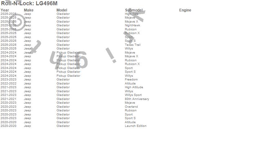 Below is an abbreviated list of applications for the Roll-N-Lock M-Series Truck Bed Cover.Gladiator, Pickup Gladiator, Jeep, 2025, 2024, 2023, 2022, 2021, 2020