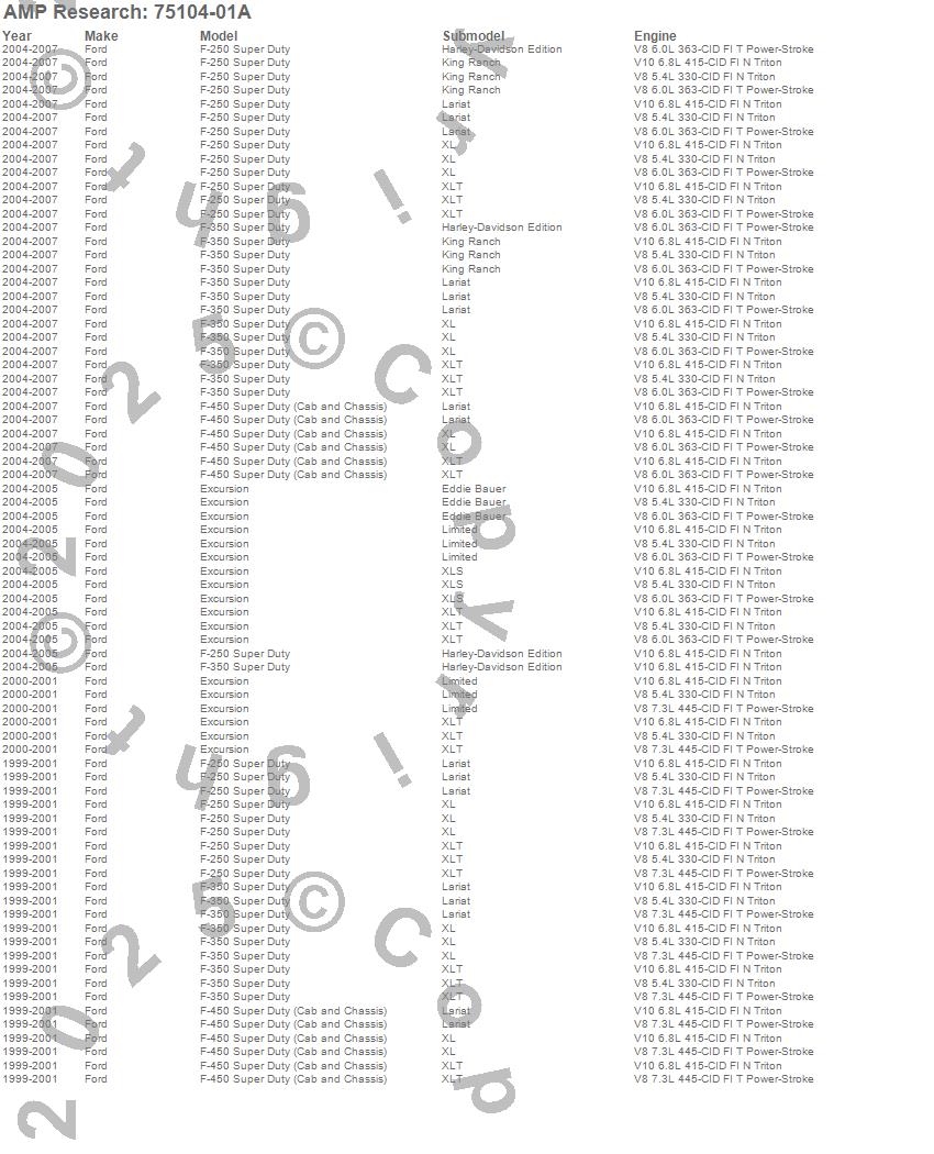 Below is an abbreviated list of applications for the PowerStep.Excursion, F-250 Super Duty, F-350 Super Duty, F-450 Super Duty, Ford, 2007, 2006, 2005, 2004, 2001, 2000, 1999
