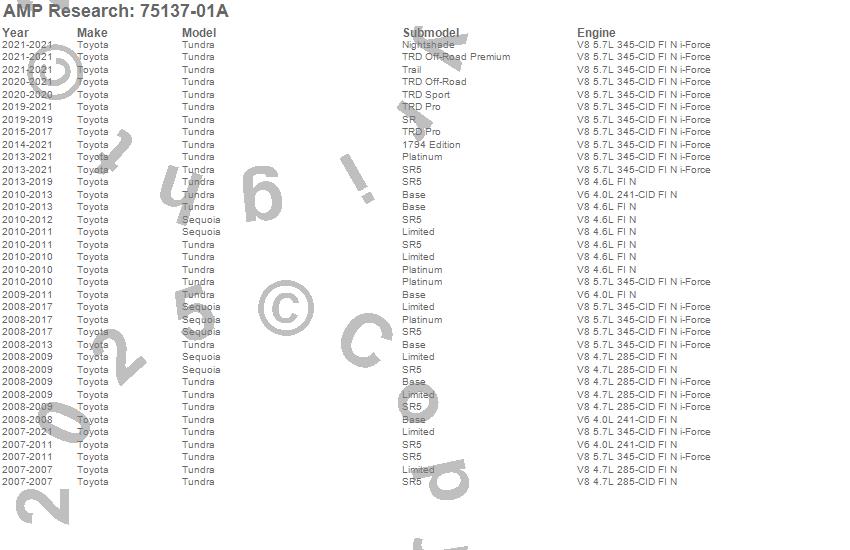 Below is an abbreviated list of applications for the PowerStep.Sequoia, Tundra, Toyota, 2021, 2020, 2019, 2018, 2017, 2016, 2015, 2014, 2013, 2012, 2011, 2010, 2009, 2008, 2007