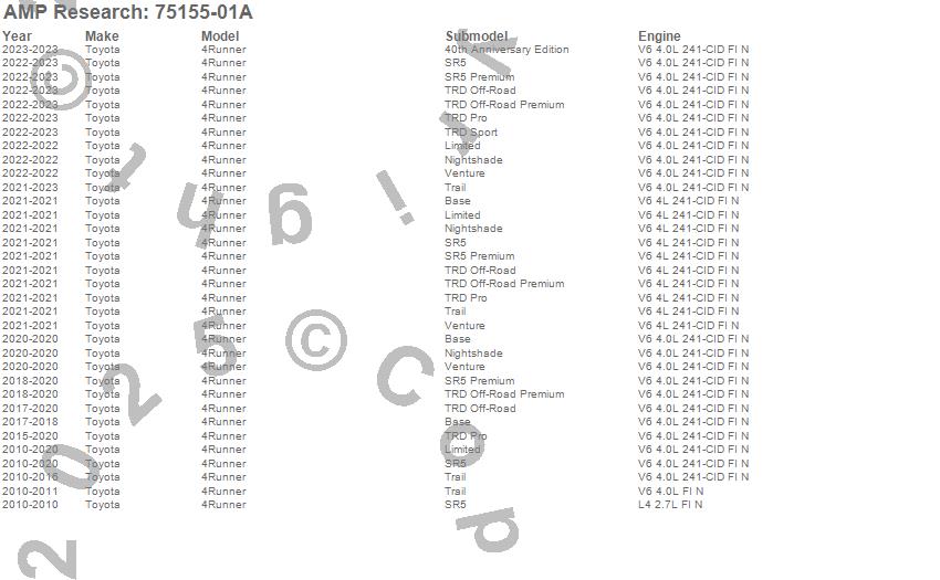 Below is an abbreviated list of applications for the PowerStep.4Runner, Toyota, 2023, 2022, 2021, 2020, 2019, 2018, 2017, 2016, 2015, 2014, 2013, 2012, 2011, 2010