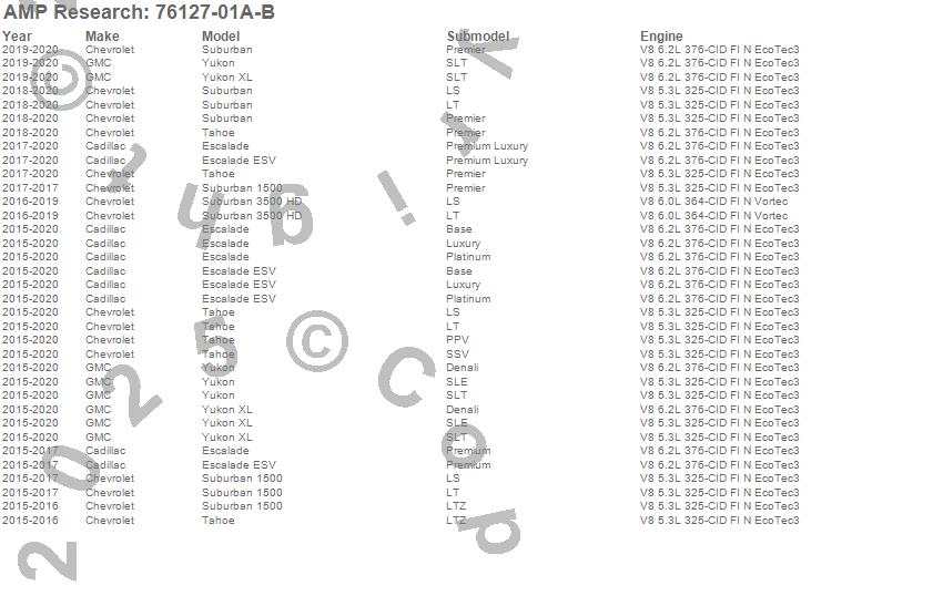 Below is an abbreviated list of applications for the PowerStep Plug-N-Play System.Escalade, Escalade ESV, Suburban, Suburban 1500, Suburban 3500 HD, Tahoe, Yukon, Yukon XL, Cadillac, Chevrolet, GMC, 2020, 2019, 2018, 2017, 2016, 2015