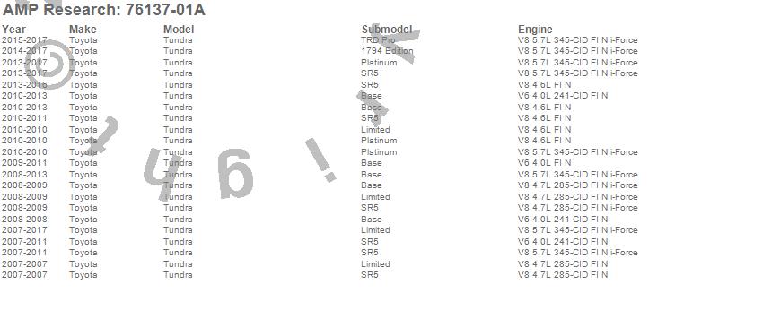 Below is an abbreviated list of applications for the PowerStep Plug-N-Play System.Tundra, Toyota, 2017, 2016, 2015, 2014, 2013, 2012, 2011, 2010, 2009, 2008, 2007