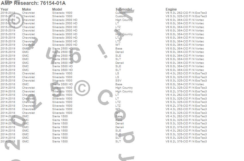 Below is an abbreviated list of applications for the PowerStep Plug-N-Play System.Sierra 1500, Sierra 2500 HD, Sierra 3500 HD, Silverado 1500, Silverado 2500 HD, Silverado 3500 HD, Chevrolet, GMC, 2019, 2018, 2017, 2016, 2015, 2014
