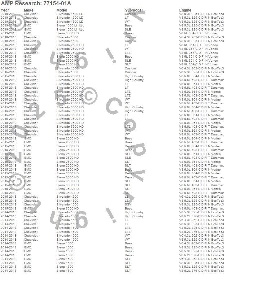 Below is an abbreviated list of applications for the PowerStep XL.Sierra 1500, Sierra 1500 Limited, Sierra 2500 HD, Sierra 3500 HD, Silverado 1500, Silverado 1500 LD, Silverado 2500 HD, Silverado 3500 HD, Chevrolet, GMC, 2019, 2018, 2017, 2016, 2015, 2014