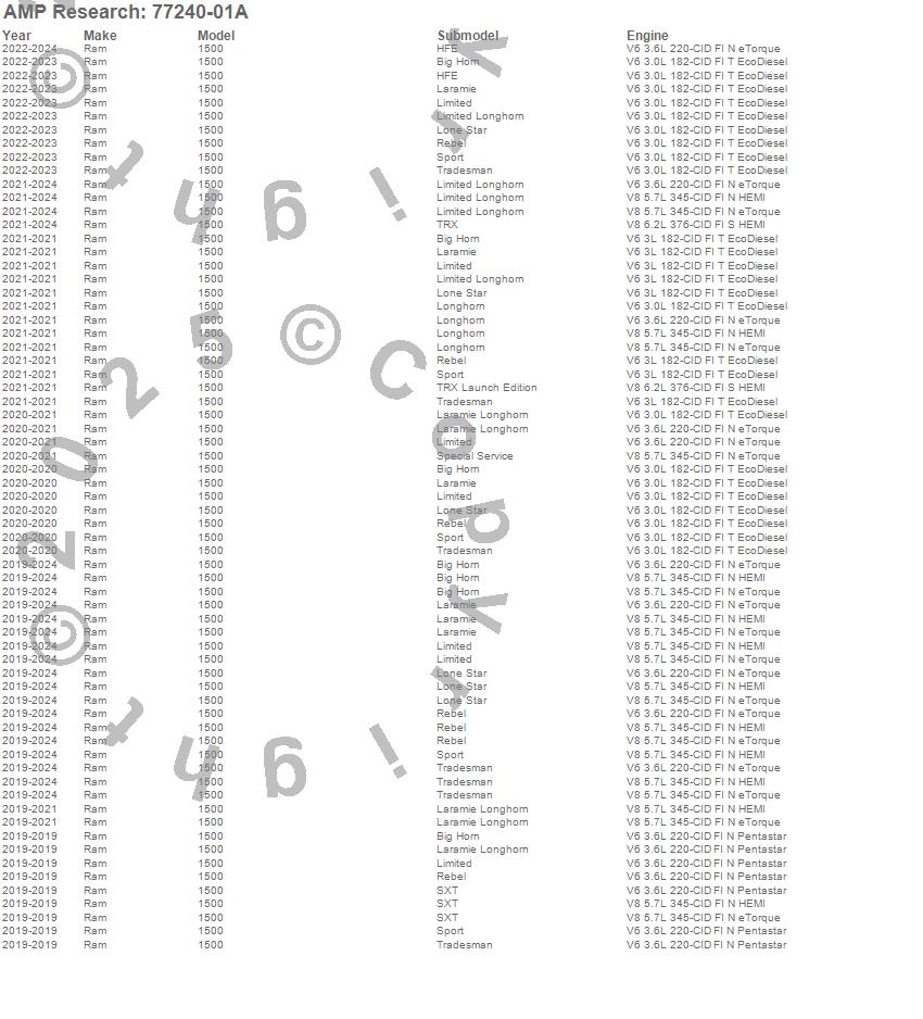 Below is an abbreviated list of applications for the PowerStep XL.1500, Ram, 2024, 2023, 2022, 2021, 2020, 2019