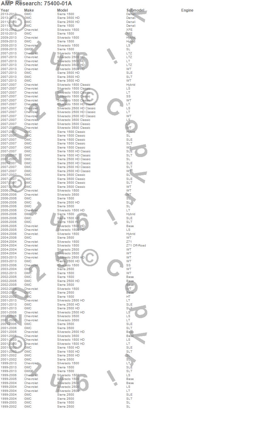 Below is an abbreviated list of applications for the BEDSTEP2.Sierra 1500, Sierra 1500 Classic, Sierra 1500 HD, Sierra 1500 HD Classic, Sierra 2500, Sierra 2500 HD, Sierra 2500 HD Classic, Sierra 3500, Sierra 3500 Classic, Sierra 3500 HD, Silverado 1500, Silverado 1500 Classic, Silverado 1500 HD, Silverado 1500 HD Classic, Silverado 2500, Silverado 2500 HD, Silverado 2500 HD Classic, Silverado 3500, Silverado 3500 Classic, Silverado 3500 HD