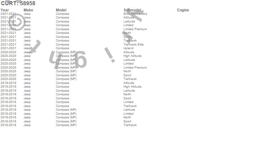 Brand: CURTPart Number: 58958Trailer Wire Connector Type: For Dinghy Towing - Incl. Harness/4-Flat Extension/Mounting Bracket And HardwareUPC: 612314589586