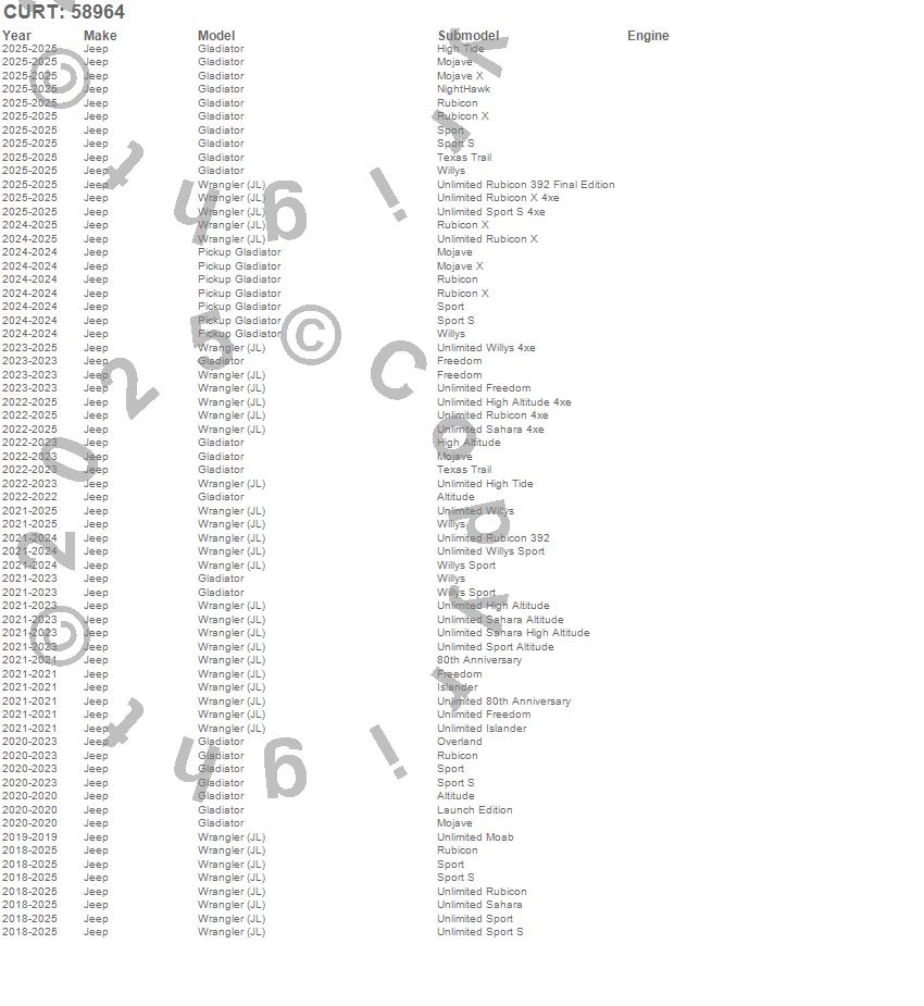 Below is an abbreviated list of applications for the Towed-Vehicle RV Harness.Gladiator, Pickup Gladiator, Wrangler (JL), Jeep, 2025, 2024, 2023, 2022, 2021, 2020, 2019, 2018