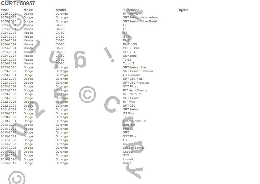 Brand: CURTPart Number: 58957Trailer Wire Connector Type: For Dinghy Towing - Incl. Harness/4-Flat Extension/Mounting Bracket And HardwareUPC: 612314589579