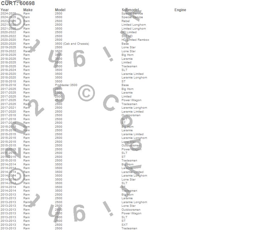 Brand: CURTPart Number: 60698Tie Down Anchor Type: OEM Gooseneck - 38000 lbs. Gross Trailer Weight - Carbide Black Powder CoatUPC: 612314606986