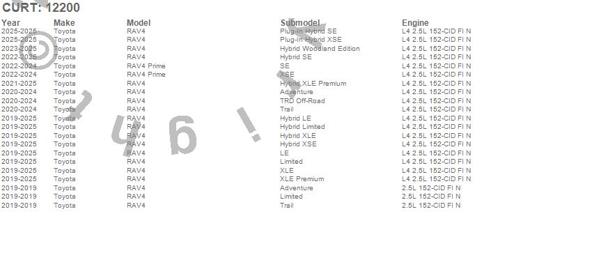 Below is an abbreviated list of applications for the Class II 1.25 in. Receiver Hitch.RAV4, RAV4 Prime, Toyota, 2025, 2024, 2023, 2022, 2021, 2020, 2019