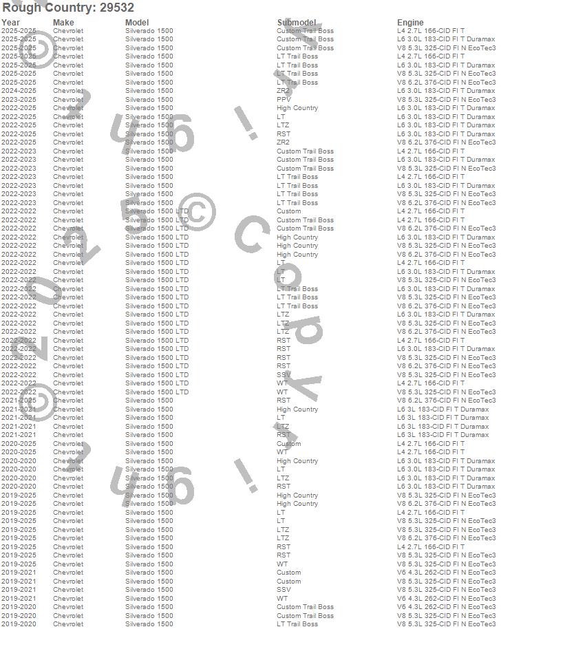 Below is an abbreviated list of applications for the Suspension Lift Kit w/Shocks.Silverado 1500, Silverado 1500 LTD, Chevrolet, 2025, 2024, 2023, 2022, 2021, 2020, 2019