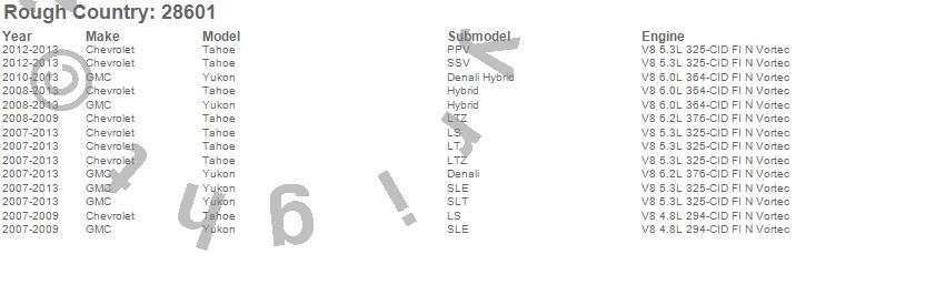 Below is an abbreviated list of applications for the Suspension Lift Kit.Tahoe, Yukon, Chevrolet, GMC, 2013, 2012, 2011, 2010, 2009, 2008, 2007