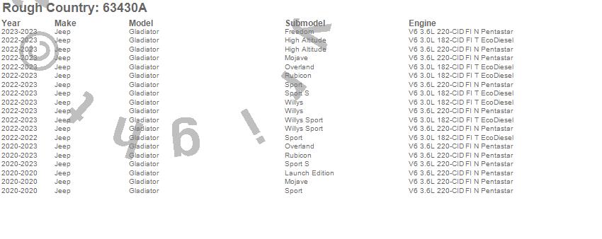 Below is an abbreviated list of applications for the Suspension Lift Kit.Gladiator, Jeep, 2023, 2022, 2021, 2020
