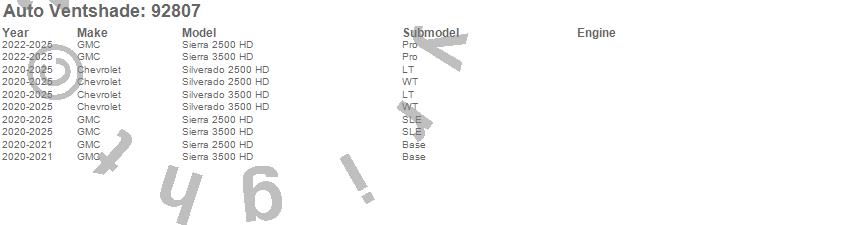 Below is an abbreviated list of applications for the Ventvisor Deflector 2 pc..Sierra 2500 HD, Sierra 3500 HD, Silverado 2500 HD, Silverado 3500 HD, Chevrolet, GMC, 2026, 2025, 2024, 2023, 2022, 2021, 2020