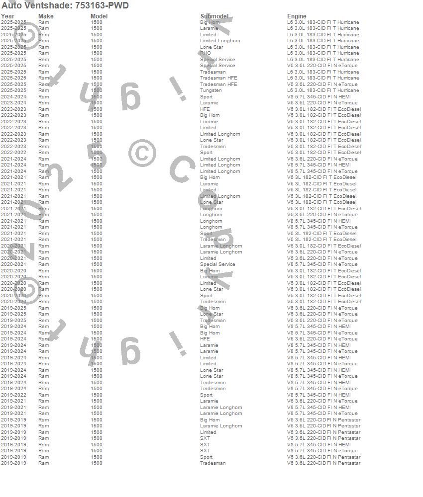 Below is an abbreviated list of applications for the Aeroskin LightShield Color-Match Hood Protector.1500, Ram, 2025, 2024, 2023, 2022, 2021, 2020, 2019