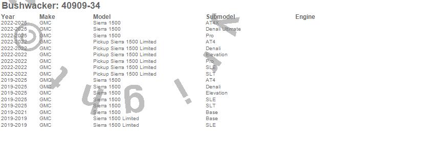 Brand: BushwackerPart Number: 40909-34Fender Flare Type: 4 pc. - Front Tire Coverage 2.5 in. - Front Height 6 in. - Rear Tire Coverage 2.5 in - Rear Height 6 in. - BlackUPC: 090689123930