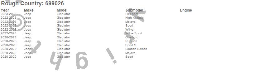 Brand: Rough CountryPart Number: 699026Shock Absorber Type: 2.5 in. Diameter - Rear - 6 in. LiftUPC: 843030194024