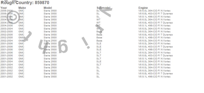 Below is an abbreviated list of applications for the Suspension Lift Kit.Sierra 2500, Sierra 3500, GMC, 2006, 2005, 2004, 2003, 2002, 2001