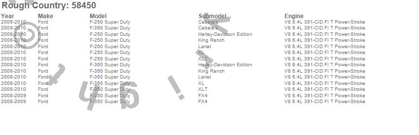 Below is an abbreviated list of applications for the Suspension Lift Kit.F-250 Super Duty, F-350 Super Duty, Ford, 2010, 2009, 2008