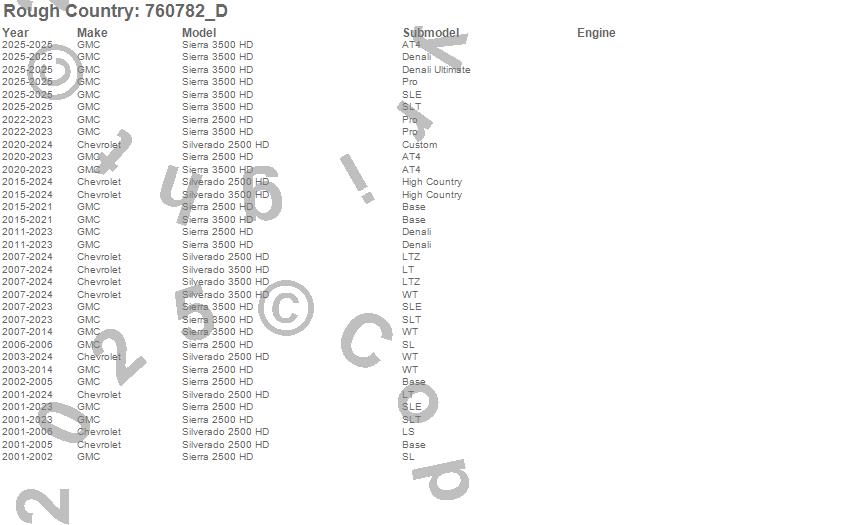 Below is an abbreviated list of applications for the V2 Monotube Shocks.Sierra 2500 HD, Sierra 3500 HD, Silverado 2500 HD, Silverado 3500 HD, Chevrolet, GMC, 2025, 2024, 2023, 2022, 2021, 2020, 2019, 2018, 2017, 2016, 2015, 2014, 2013, 2012