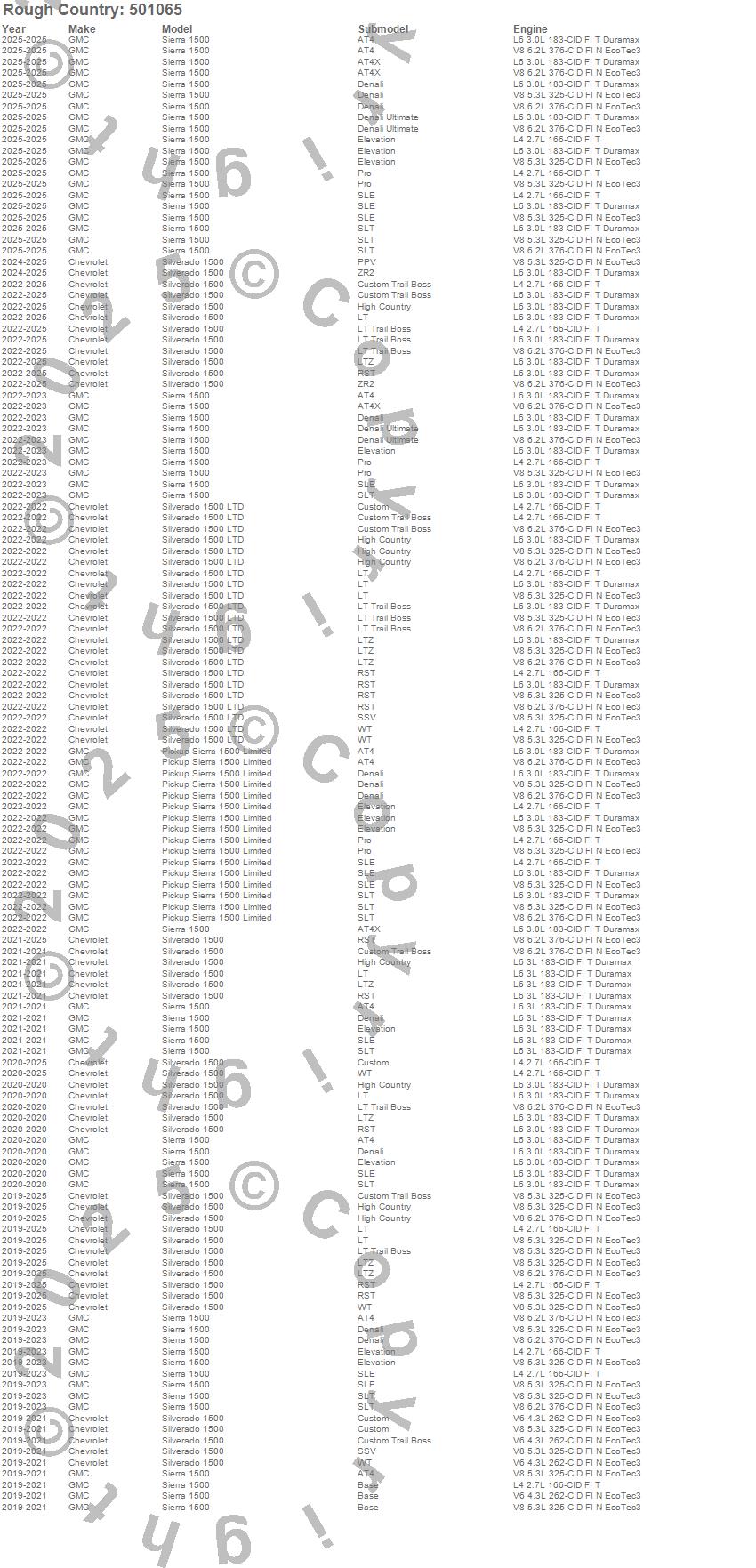 Below is an abbreviated list of applications for the Leveling Kit.Pickup Sierra 1500 Limited, Sierra 1500, Silverado 1500, Silverado 1500 LTD, Chevrolet, GMC, 2025, 2024, 2023, 2022, 2021, 2020, 2019