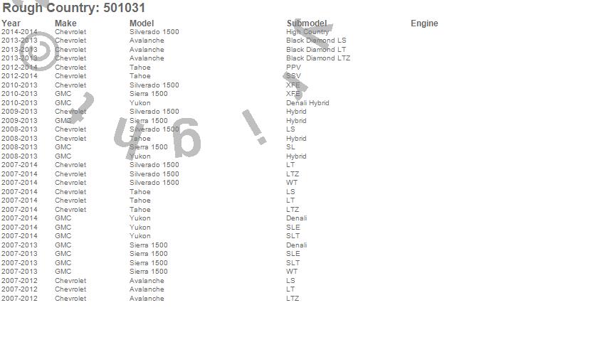 Below is an abbreviated list of applications for the Lifted N3 Struts.Avalanche, Sierra 1500, Silverado 1500, Tahoe, Yukon, Chevrolet, GMC, 2014, 2013, 2012, 2011, 2010, 2009, 2008, 2007