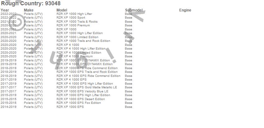 Below is an abbreviated list of applications for the Coil Spring Kit.RZR XP 1000, RZR XP 1000 EPS, RZR XP 1000 EPS Desert Edition, RZR XP 1000 EPS DYNAMIX Edition, RZR XP 1000 EPS Fox Edition, RZR XP 1000 EPS Gold Matte Metallic LE, RZR XP 1000 EPS High Lifter Edition, RZR XP 1000 EPS Ride Command Edition, RZR XP 1000 EPS Trails and Rock Edition, RZR XP 1000 EPS Velocity Blue LE, RZR XP 1000 High Lifter, RZR XP 1000 High Lifter Edition, RZR XP 1000 Limited Edition, RZR XP 1000 Premium, RZR XP 1000 Sport, RZR XP 1000 Trails & Rocks, RZR XP 1000 Trails and Rock Edition, RZR XP 4 1000, RZR XP 4 1000 EPS, RZR XP 4 1000 EPS DYNAMIX Edition
