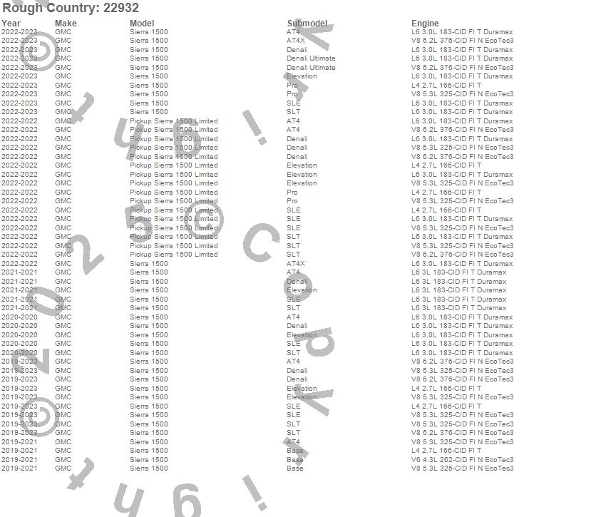 Below is an abbreviated list of applications for the Suspension Lift Kit w/Shocks.Pickup Sierra 1500 Limited, Sierra 1500, GMC, 2023, 2022, 2021, 2020, 2019