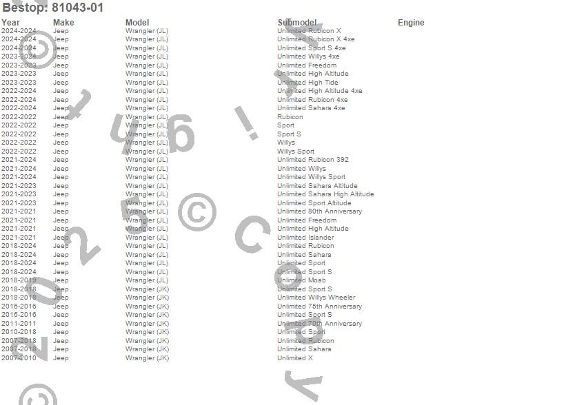 Below is an abbreviated list of applications for the All Weather Trail Cover For Jeep.Wrangler, Wrangler (JK), Wrangler (JL), Jeep, 2026, 2024, 2023, 2022, 2021, 2020, 2019, 2018, 2017, 2016, 2015, 2014, 2013, 2012, 2011, 2010