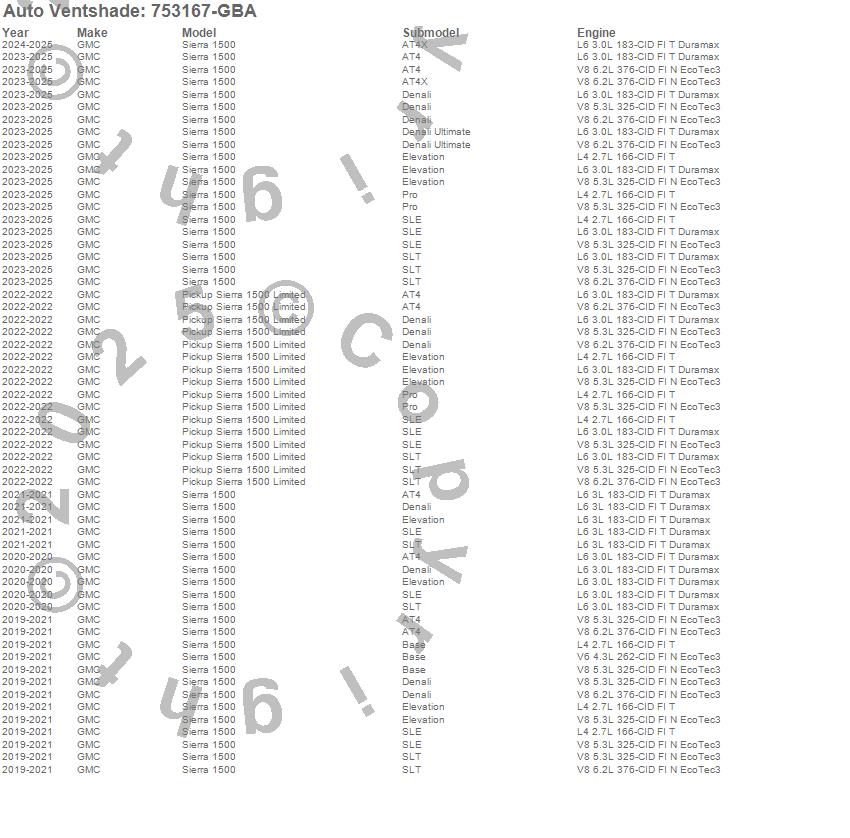 Below is an abbreviated list of applications for the Aeroskin LightShield Hood Protector.Pickup Sierra 1500 Limited, Sierra 1500, GMC, 2025, 2024, 2023, 2022, 2021, 2020, 2019