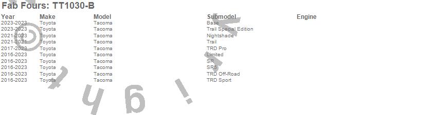 Brand: Fab FoursPart Number: TT1030-BDoor Type: BareUPC: 005810121617