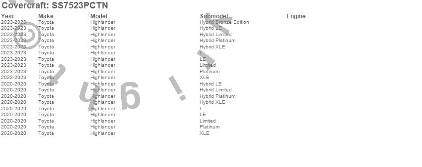 Below is an abbreviated list of applications for the SeatSaver Custom Seat Cover.Grand Highlander, Highlander, Toyota, 2025, 2024, 2023, 2020