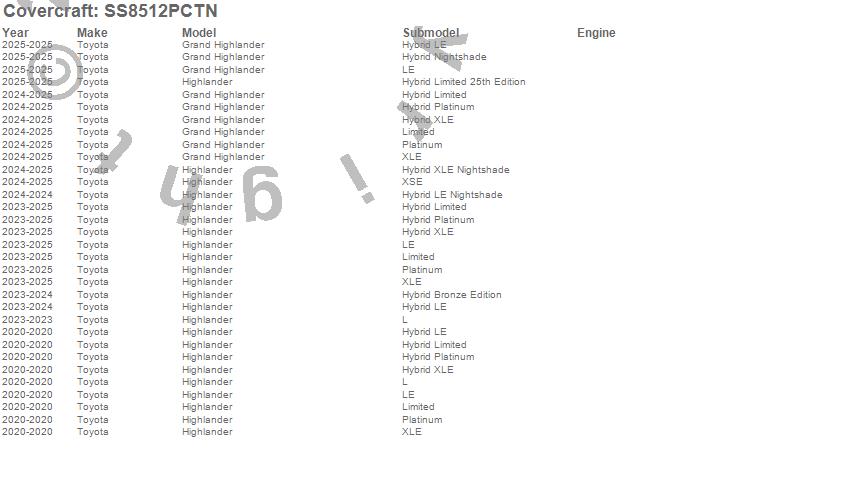 Below is an abbreviated list of applications for the SeatSaver Custom Seat Cover.Grand Highlander, Highlander, Toyota, 2025, 2024, 2023, 2020