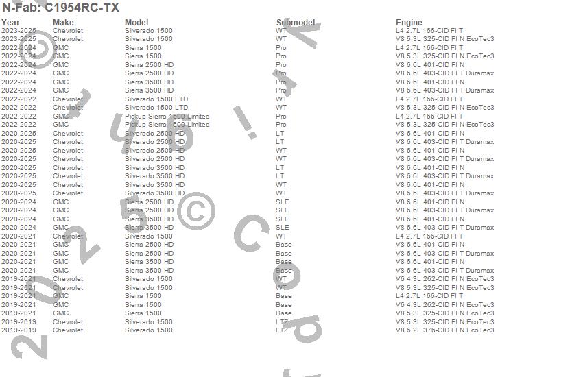 Below is an abbreviated list of applications for the Cab Length Nerf Step Bar.Pickup Sierra 1500 Limited, Sierra 1500, Sierra 2500 HD, Sierra 3500 HD, Silverado 1500, Silverado 1500 LTD, Silverado 2500 HD, Silverado 3500 HD, Chevrolet, GMC, 2025, 2024, 2023, 2022, 2021, 2020, 2019
