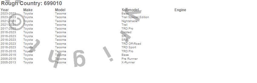 Below is an abbreviated list of applications for the Adjustable Vertex Shocks.Tacoma, Toyota, 2023, 2022, 2021, 2020, 2019, 2018, 2017, 2016, 2015, 2014, 2013, 2012, 2011, 2010, 2009, 2008, 2007, 2006