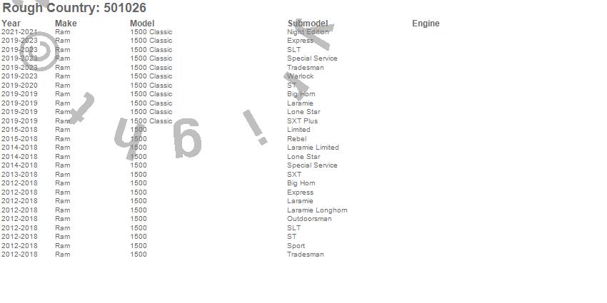 Brand: Rough CountryPart Number: 501026Suspension Strut Assembly Type: 6 in.UPC: 843030170097