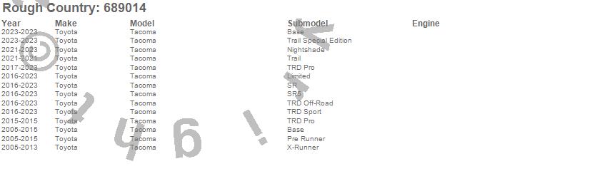Below is an abbreviated list of applications for the Adjustable Vertex Coilovers.Tacoma, Toyota, 2023, 2022, 2021, 2020, 2019, 2018, 2017, 2016, 2015, 2014, 2013, 2012, 2011, 2010, 2009, 2008, 2007, 2006