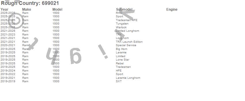 Brand: Rough CountryPart Number: 699021Shock Absorber Type: Rear - 6 in. - Collapsed Length 17.75 in. - Extended Length 29.33 in. - 2.5 in Piston - Zinc Plate Finish - Double Clear CoatUPC: 843030196271