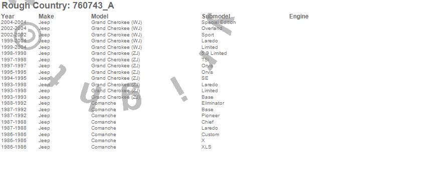 Below is an abbreviated list of applications for the V2 Shock Absorbers.Comanche, Grand Cherokee (WJ), Grand Cherokee (ZJ), Jeep, 2004, 2003, 2002, 2001, 2000, 1999, 1998, 1997, 1996, 1995, 1994, 1993, 1992, 1991, 1990, 1989