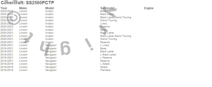 Below is an abbreviated list of applications for the SeatSaver Custom Seat Cover.Aviator, Navigator, Lincoln, 2025, 2024, 2023, 2022, 2021, 2020, 2019, 2018