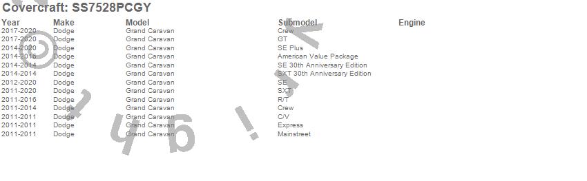 Below is an abbreviated list of applications for the SeatSaver Custom Seat Cover.Grand Caravan, Dodge, 2020, 2019, 2018, 2017, 2016, 2015, 2014, 2013, 2012, 2011